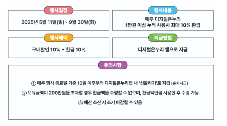 - 행사 기간 전통시장 등에서 **10만 원 사용** → 1만 원 환급