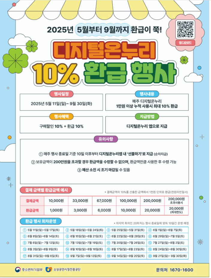 디지털 온누리상품권은 **충전 할인 + 환급 이벤트**를 동시에 누릴 수 있는 실속 소비 수단입니다. 특히 **5월부터 9월까지 매주 최대 2만 원 환급**까지 챙긴다면, 전통시장 이용은 물론 **20% 할인 효과**까지 누릴 수 있는 최고의 기회!