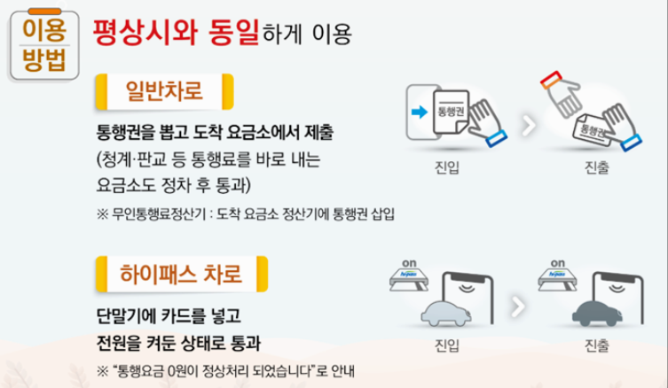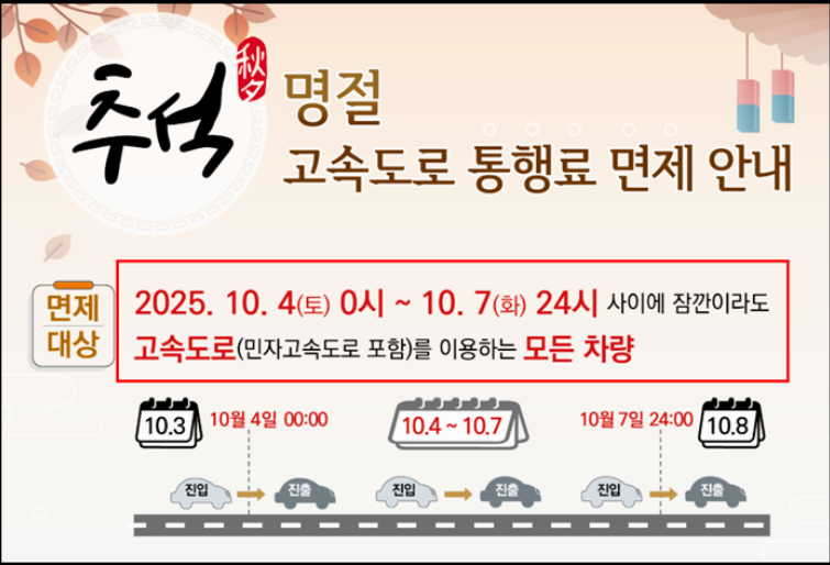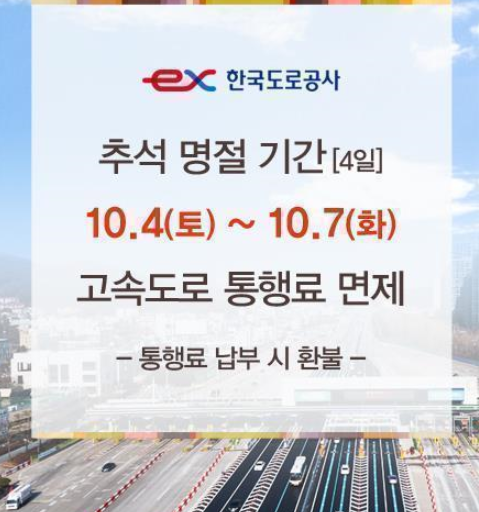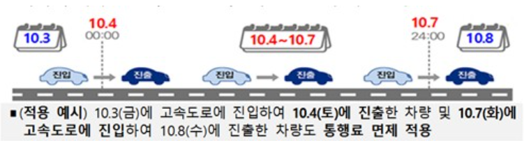 - 통행료 면제 기간: 10월 4일 ~ 10월 7일