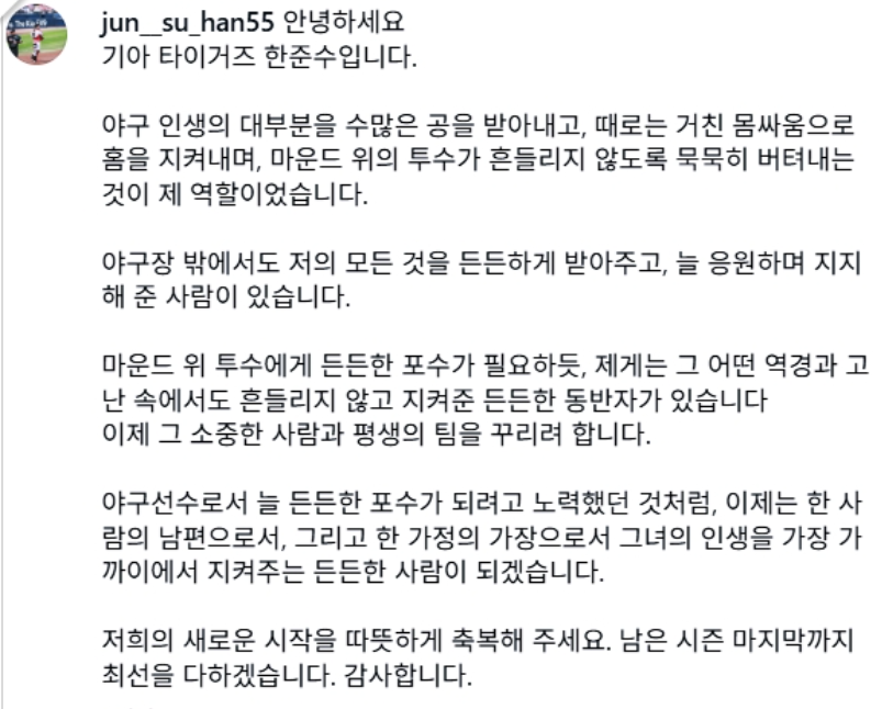 2025년 9월 25일, KIA 타이거즈 소속의 한준수 선수는 자신의 SNS를 통해 깜짝 결혼 발표를 했습니다.