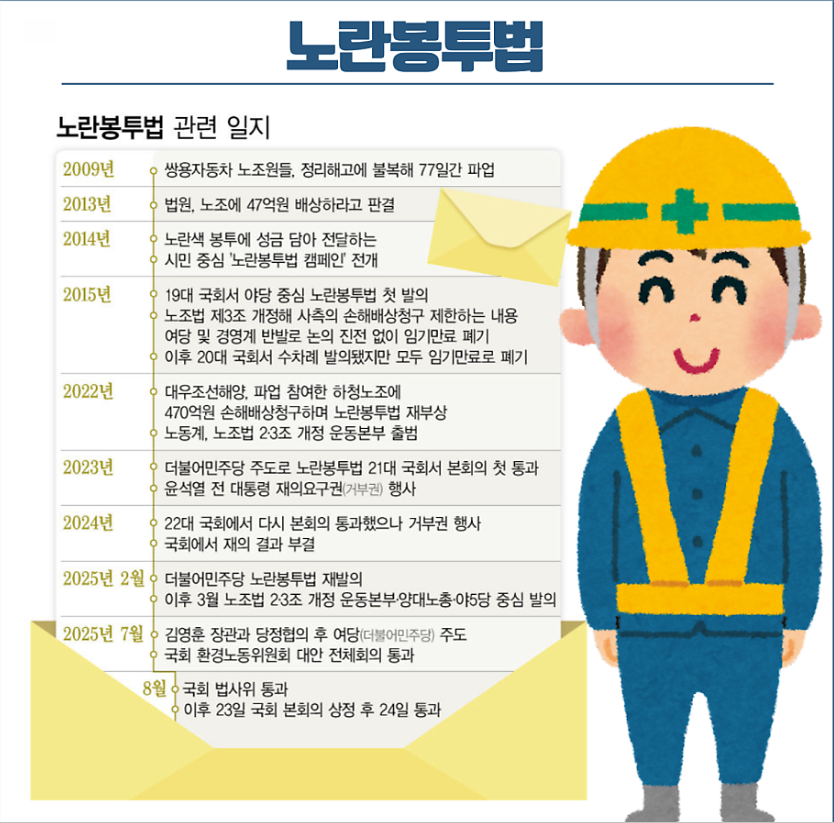 2025년 현재, 노란봉투법은 아직도 발전 중이며, 앞으로 더 많은 사회적 합의와 제도 보완을 통해 보다 성숙한 노동시장으로 나아갈 수 있을 것입니다.