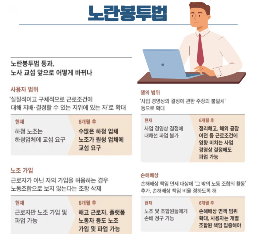 이는 단순한 법률 개정이 아니라, 헌법상 노동 3권 보장의 실질화를 위한 핵심 제도 변화로 평가됩니다.