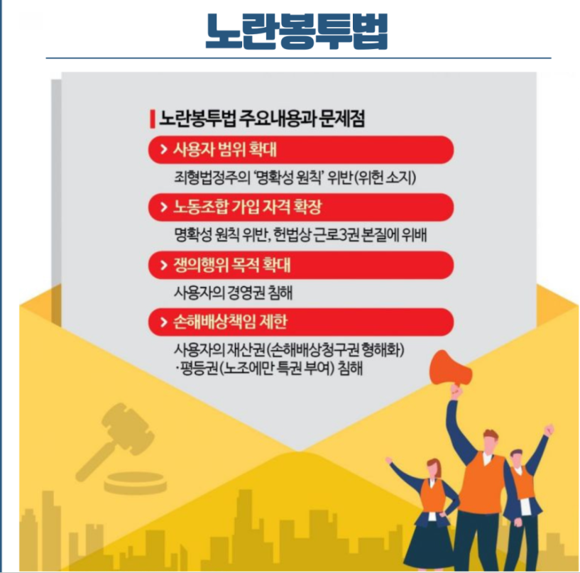 노란봉투법은 노동조합 및 노동관계조정법 일부개정안으로, 노동자들이 파업이나 집단행동 등 단체행동권을 행사할 때 발생할 수 있는 손해배상 청구와 가압류를 제한하는 내용을 담고 있습니다. 해당 법안의 핵심은 노동 3권(단결권, 단체교섭권, 단체행동권)을 실질적으로 보장하는 데에 있습니다.